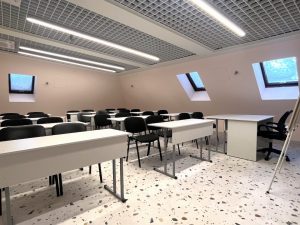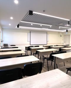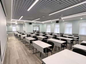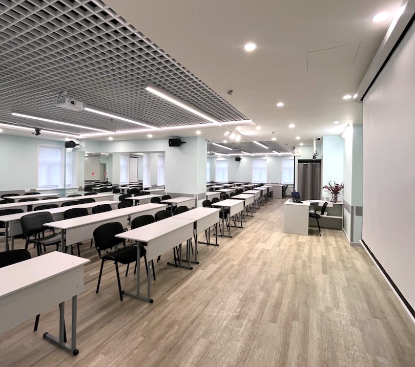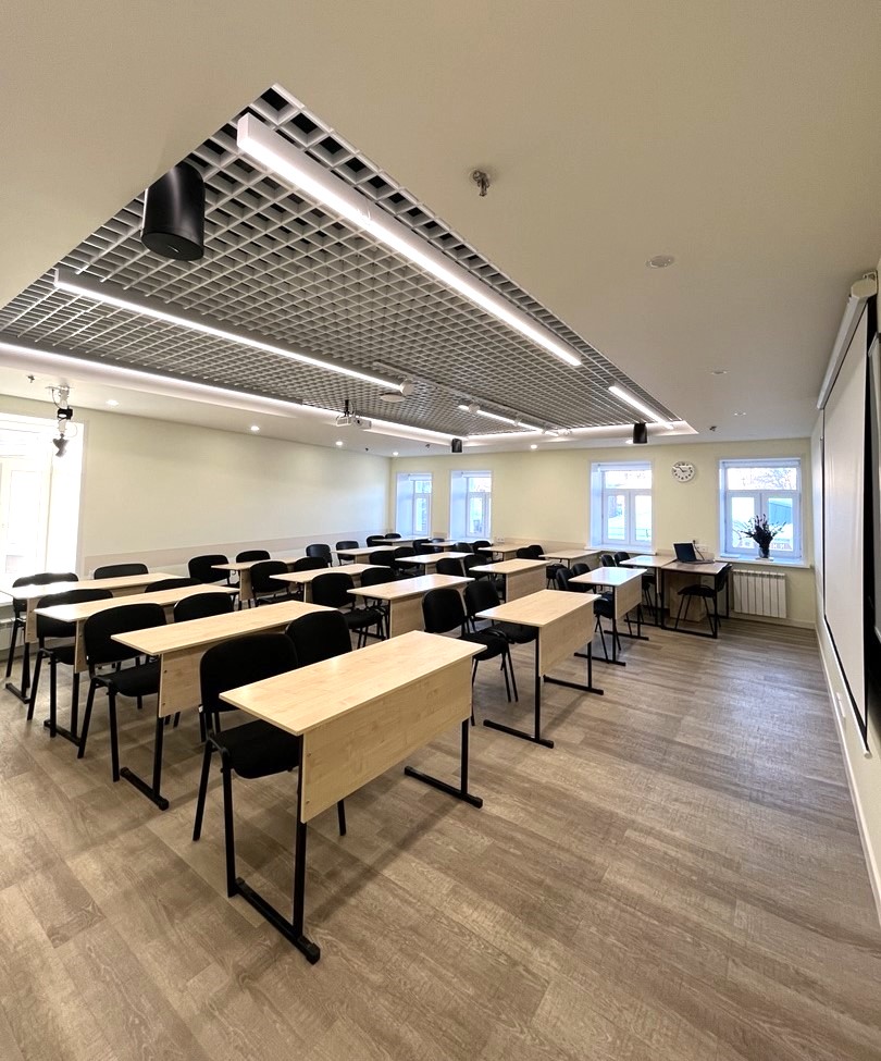 Об аудиторииСовременная и просторная аудитория на 3м этаже, площадью 55 м², и пятью окнами Оснащена проектором (+экраном), маркерной доской, партами и стульями