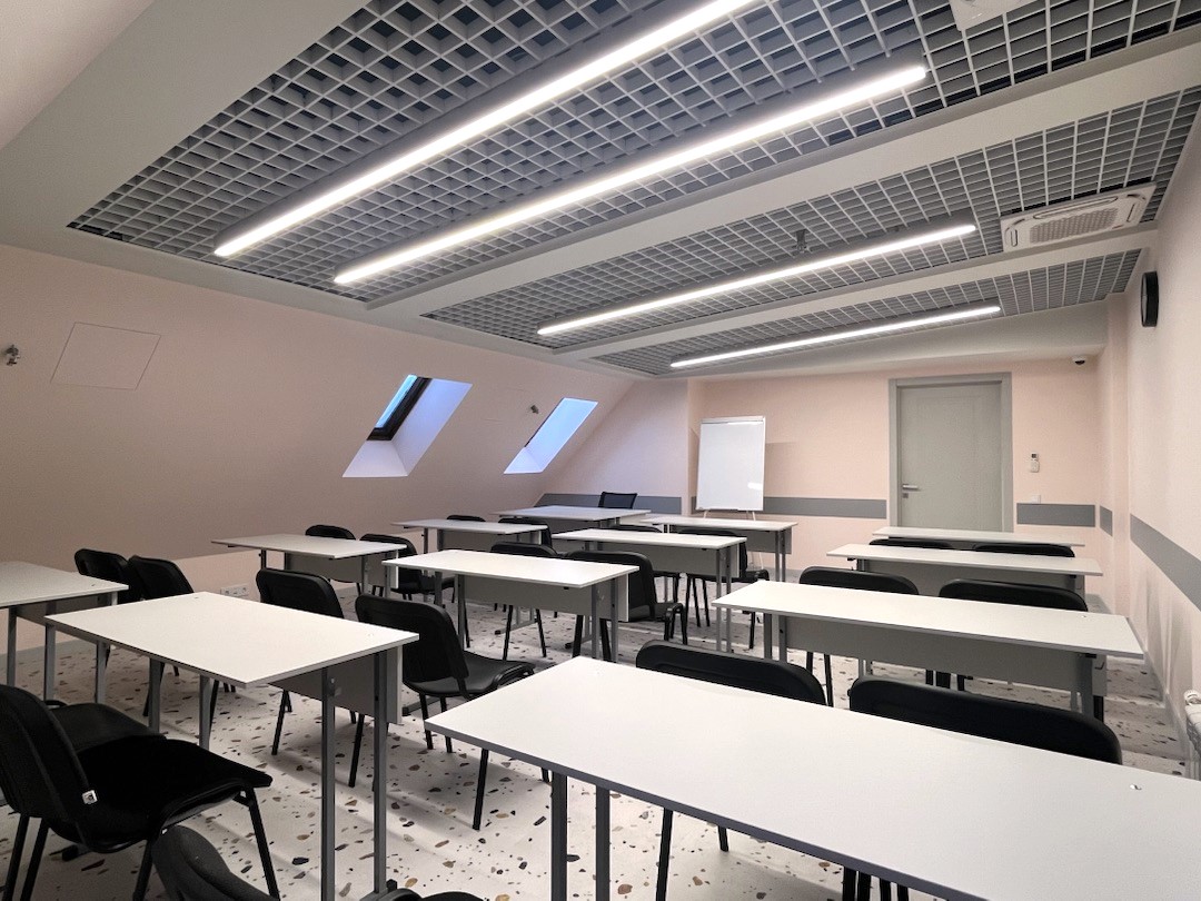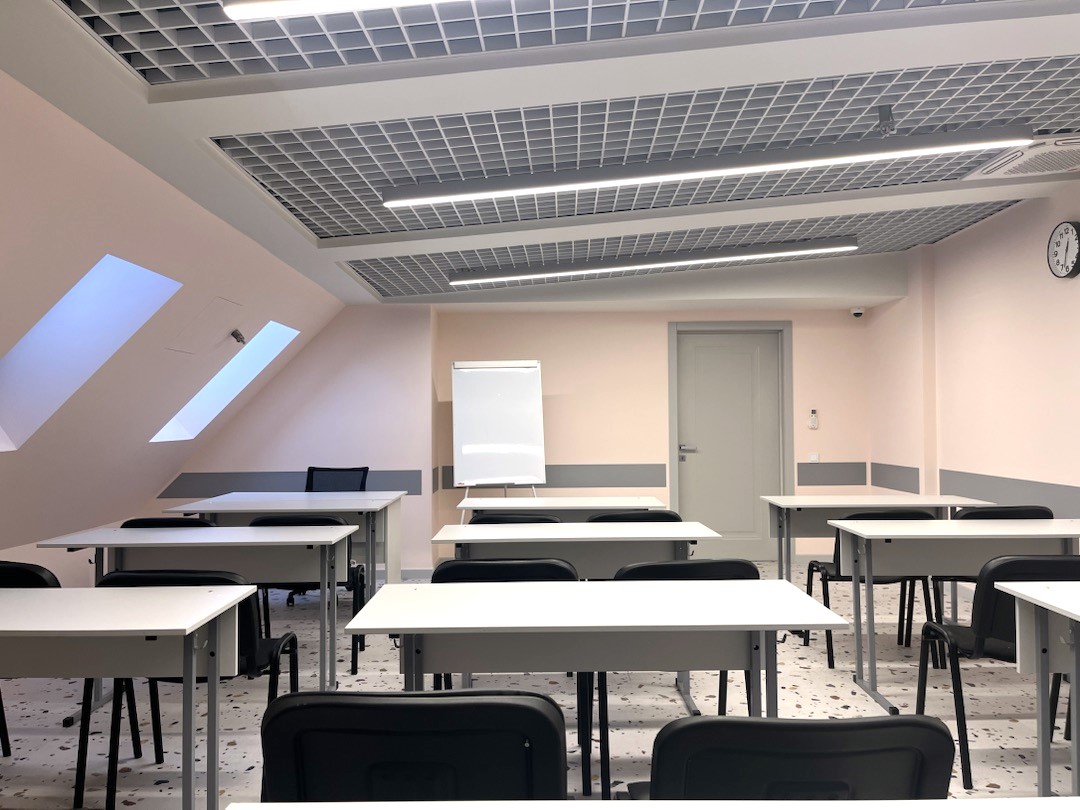Об аудиторииАудитория на 5м этаже с персиковыми стенами и полом терраццо, площадью 53 м² и тремя мансардными окнами. Оборудована кондиционером и приточно-вытяжной вентиляцией.